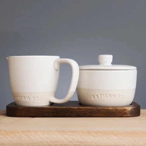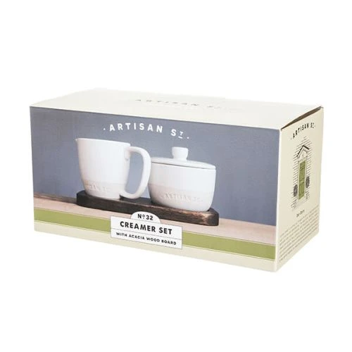 The Artisan Street creamer set includes a ceramic dish with lid and a large handled jug stood on an acacia wooden board. The ceramic jug and dish include the brand logo embossed in the side. The board of the creamer set is made from acacia wood finished with a dark stain.