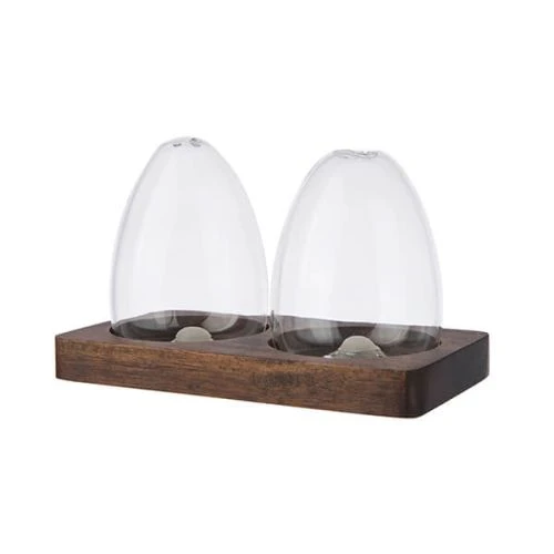 The Artisan Street salt and pepper set feature two glass shakers on top of an acacia wooden board finished in a dark stain. These can be filled with salt and pepper of your choice, the glass making it possible to know which one is which.