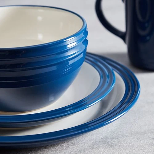 The blue dinnerware set includes 4 x 10.5 inch dinner plates, 4 x 8 inch side plates, 4 x 6 inch bowls and 4 mugs. Each mug has a 300ml capacity.