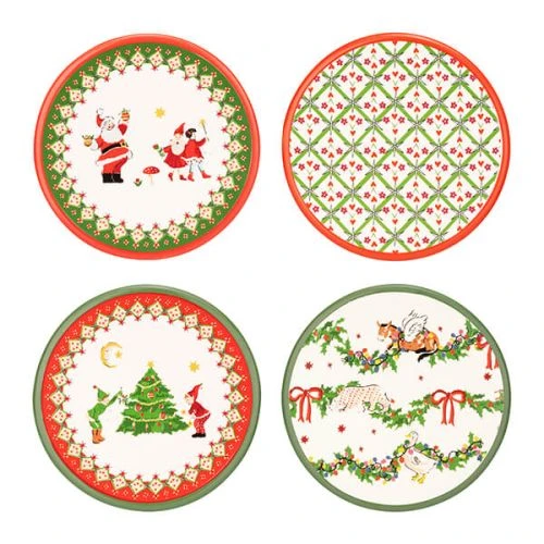The Cath Kidston Christmas Cork Back Pack of 4 Ceramic Coasters have a ceramic holder to keep all of the coasters together as a set for when they are not being used. They are all beautifully designed in festive colours of red, green and gold with whimsical Christmas settings.