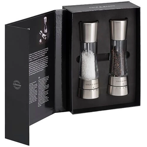This Salt & Pepper Mill Gift Set features a salt and pepper mill in a stylish presentation box.