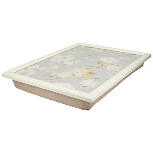 The Creative Tops Duck Egg Floral Laptray features a gorgeous vintage-inspired pattern with a little bird with golden-flecked feathers perched on soft white blossom branches.