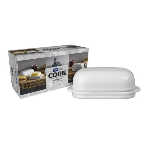 Store your butter in this stylish and practical James Martin Cook Butter Box. Made from porcelain, this butter box has a soft grey outer glaze with a crisp white interior.