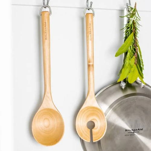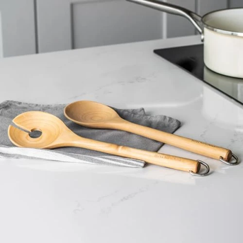 Crafted from environmentally friendly Birchwood, this set of KitchenAid Birchwood Salad Servers is ideal for tossing and serving a variety of salads. Can also be used to serve vegetables, meats and more. Safe to use on all types of cookware and bakeware, including ceramic, cast iron and non-stick, these salad servers also include handy stainless steel hanging hooks.