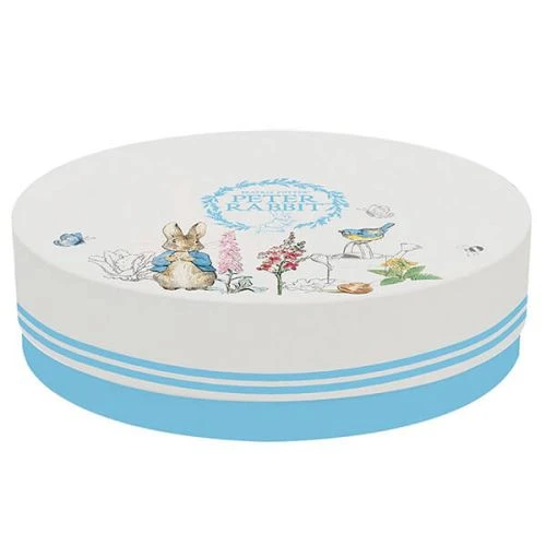 The bottom plate features a Classic Peter Rabbit design contrasting with the blue and white polka-dot and concentric circles top plate.