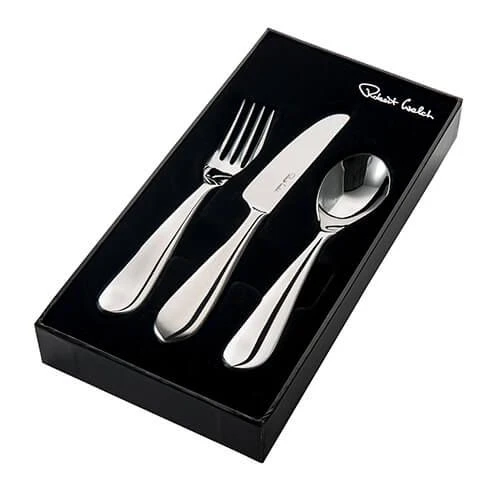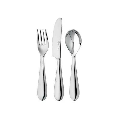 This child’s cutlery set is comprised of a knife, fork and spoon and has a mirror-polished finish.