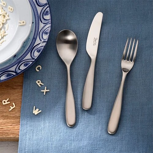 This child’s cutlery set is comprised of a knife, fork and spoon and has a mirror-polished finish.