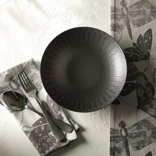 The Living Jewels Black Pasta Bowl is beautifully detailed with bugs, linking to the nature theme throughout the Kews range.