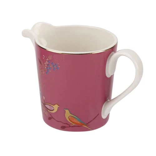 This Sara Miller Chelsea Collection Cream Jug features two birds perched upon the branch of a blossom tree on a striking hot pink background.