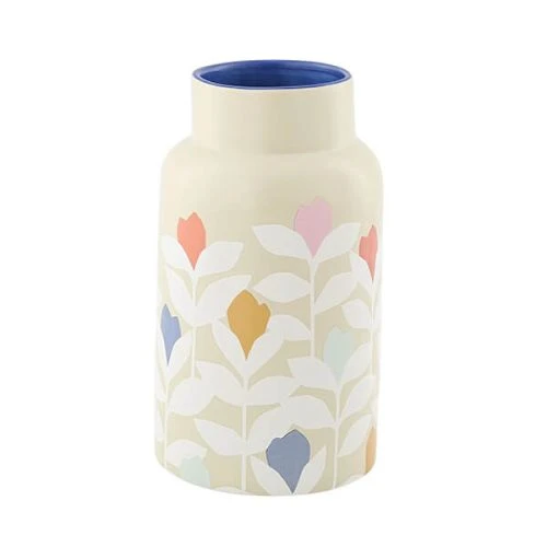 The Scion Living Padukka Vase brings a beautiful floral flair with stylised stems in pastel tones of pink, yellow, red and blue against a creamy background.