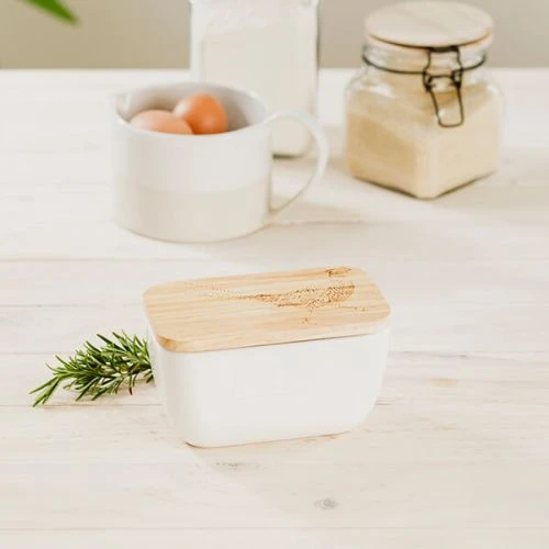 Add a homely countryside touch to the kitchen with the Just Slate Company Pheasant White Butter Dish. This stylish ceramic and oak butter dish enables butter to be served at the perfect temperature. To ensure freshness, the wooden lid includes a seal. The oak lid is also engraved with a curious pheasant.