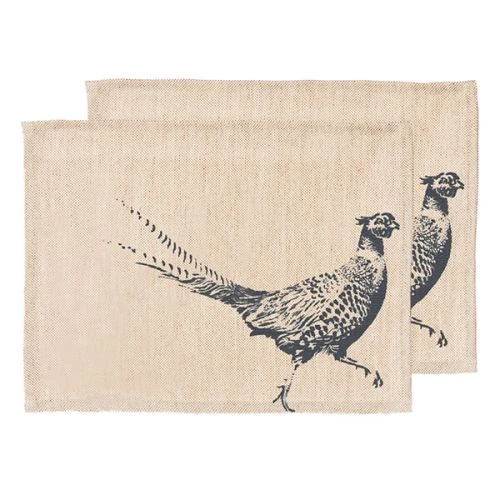 Providing a natural backdrop to your dinner setting, the Just Slate Company Set of 2 Pheasant Linen Place Mats bring a minimalist look to the table while adding a touch of simple sophistication, perfect go-to pieces for every day use or dinner parties. Each of the linen/cotton blend place mats is screen printed with a unique pheasant design.