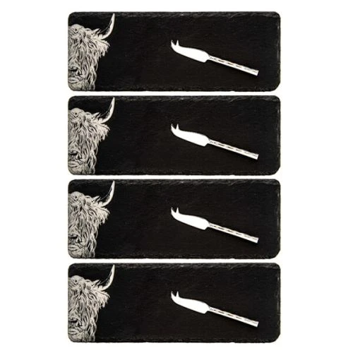 The Just Slate Company Set of 4 Highland Cow Mini Slate Cheese Board & Knife Sets
