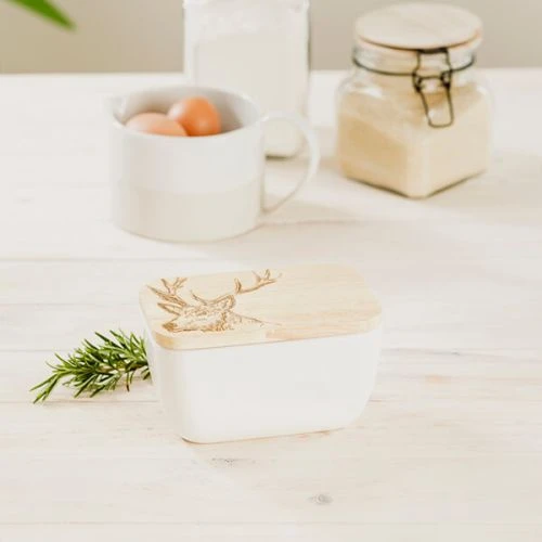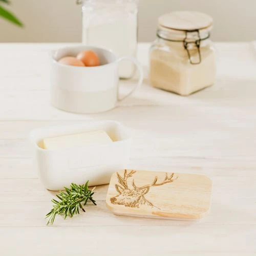 Add a homely countryside touch to the kitchen with the Just Slate Company Stag White Butter Dish. This stylish ceramic and oak butter dish enables butter to be served at the perfect temperature. To ensure freshness, the wooden lid includes a seal. The oak lid is also engraved with a majestic stag.
